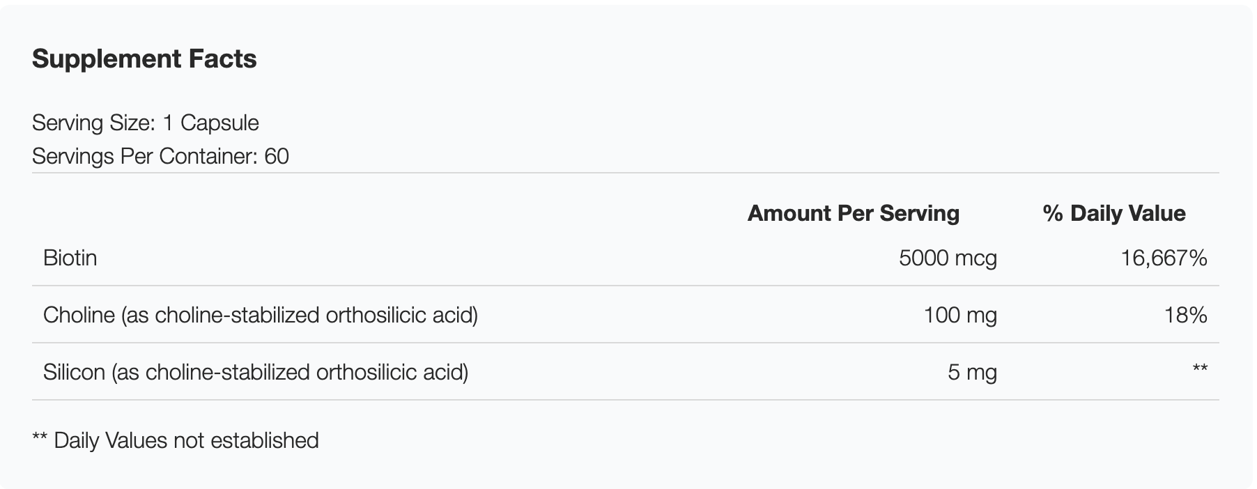 Features clinically tested ch-OSA®(Choline-Stabilized Orthosilicic Acid) complemented with Biotin.