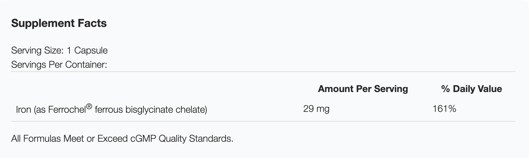 Iron bis-glycinate is a well-studied, 100% fully-reacted, patented form of iron exclusively from Albion® Laboratories. The amino acid glycine is actually one of the two starting materials the body uses to synthesize hemoglobin. Therefore, Iron Glycinate™ contributes two key factors. This form of iron has higher bioavailability, lower toxicity, less food reactivity, less food interactions and has a longer shelf life than any other common form of iron.