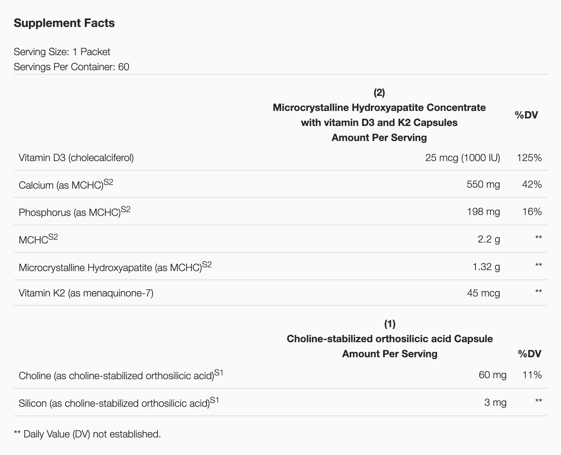 Each packet contains: 2 Microcrystalline Hydroxyapatite Concentrate with vitamins D3 and K2 capsules and 1 Choline-stabilized orthosilicic acid capsule. -