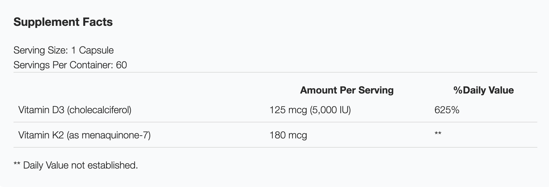 K2-D3 is formulated for those who need a more substantial presence of vitamin K2, delivering 180 mcg per serving. The combination of highly bioavailable and bioactive menaquinone-7 (MK-7) with vitamin D3 provides complementary benefits for bone and cardiovascular health.*